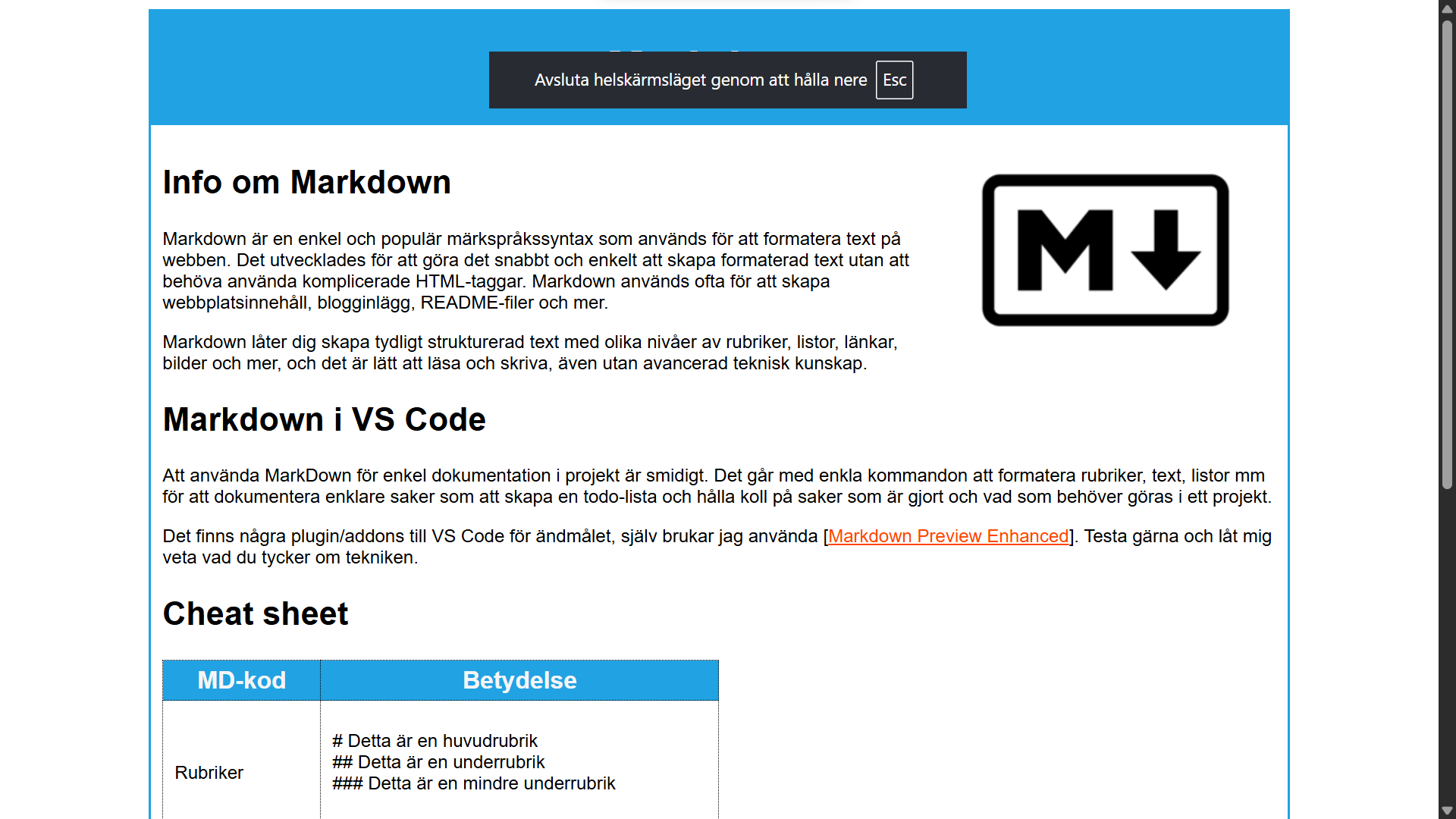 Mitt första projekt gjorde jag om Markdown som är ett markup language. Markdown är en lättläst och enkel märkspråksyntax som används för att formatera text på webben. Med en minimalistisk uppsättning taggar möjliggör Markdown snabb och lätt formatering av text med betoning på läsbarhet. Det är populärt för att skriva dokument, blogginlägg och README-filer, och stöds av många plattformar och redigeringsverktyg.